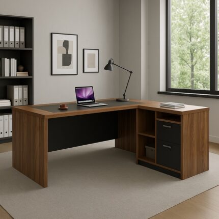Γραφείο διεύθυνσης με ενσωματωμένο γωνιακό αναστρέψιμο ερμάριο στον εντυπωσιακό χρωματισμό: φυσικό – ανθρακί. Κατασκευασμένο από υλικά υψηλών προδιαγραφών και σύμφωνα με τις εργονομικές απαιτήσεις του σήμερα.