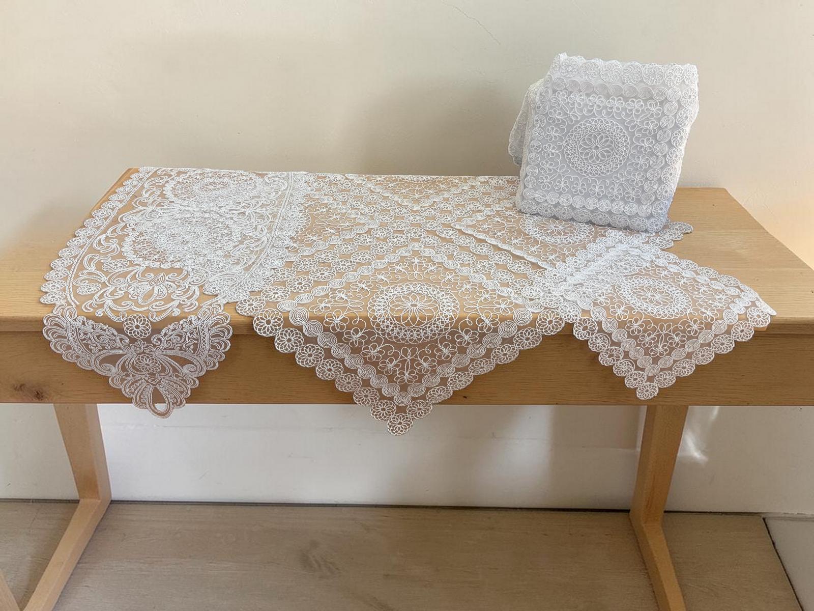 Κομψό και διαχρονικό σετ με φίνο δαντελωτό σχέδιο, ιδανικό για να αναδείξει το τραπέζι ή το σαλόνι σας με διακριτική πολυτέλεια.