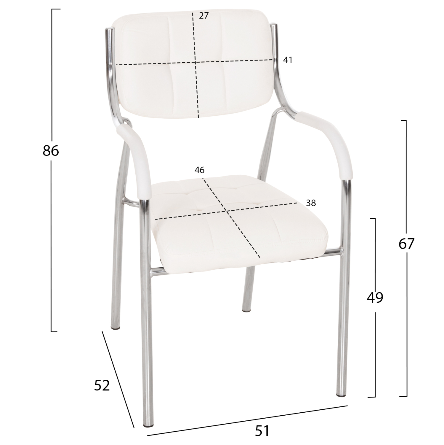 Κάντε τους επισκέπτες σας να αισθανθούν άνετα με την καρέκλα OBERON. Πρόκειται για μια καρέκλα γραφείου συνεργασίας σε λευκό χρώμα και λιτό σχεδιασμό αλλά σίγουρα όμορφο. Είναι χρωμιωμένη ενώ το κάθισμα και η πλάτη είναι ανεξάρτητα μεταξύ τους. Το μπροστά μέρος του καθίσματος έχει μια ελαφριά κλίση για να είναι πιο ευχάριστη και άνετη στην χρήση, ενώ η επένδυσή της είναι σε στυλ τετραγωνισμένου καπιτονέ, τόσο στο κάθισμα, όσο και στην πλάτη. Ο σκελετός της καρέκλας έχει όμορφες καμπύλες ενώ τα μπράτσα έχουν επένδυση πολυκαρβονική για πιο ευχάριστη υφή.