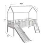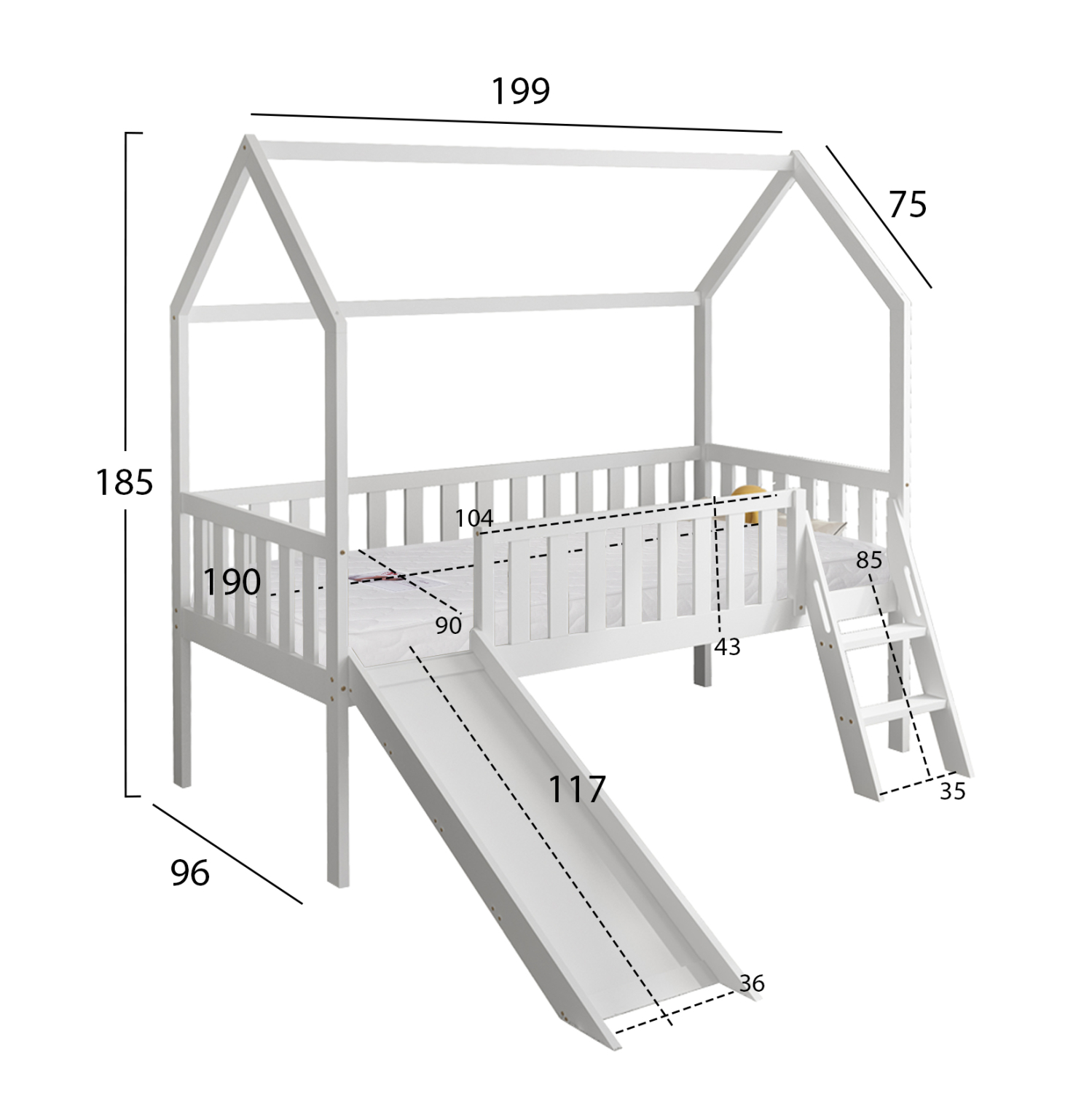 Το παιδικό κρεβάτι PHYLLIS τύπου Montessori σε διάσταση για στρώμα 90×190εκ, είναι κατασκευασμένο από ξύλο πεύκου σε ΛΕΥΚΟ χρώμα. Ολόκληρο το κρεβάτι είναι υπερυψωμένο και έχει σχήμα σπιτιού αλλά αυτό που κάνει τα παιδιά να το λατρέψουν είναι ότι διαθέτει τσουλήθρα προσφέροντας ατελείωτες ώρες παιχνιδιού και χαράς. Η πρόσβαση στο κρεβάτι γίνεται με μια μικρή σκαλίτσα, εξυπηρετώντας και τον σκοπό της τσουλήθρας, ενώ το στρώμα τοποθετείται σε τάβλες από κόντρα-πλακέ ξυλεία.
